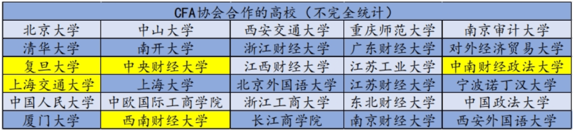 目前,国内多所财经类院校均引入CFA课程,以此来提高教学质量,拓宽学生国际视野以及专业知识面。在研究生择校阶段,CFA+FRM班的学生可优先考虑CFA/FRM密切合作的高校。在研究生面试环节中,学生对于专业知识的阐释具有优势,且一定程度上也将会证明该生对研究生课程的胜任能力。