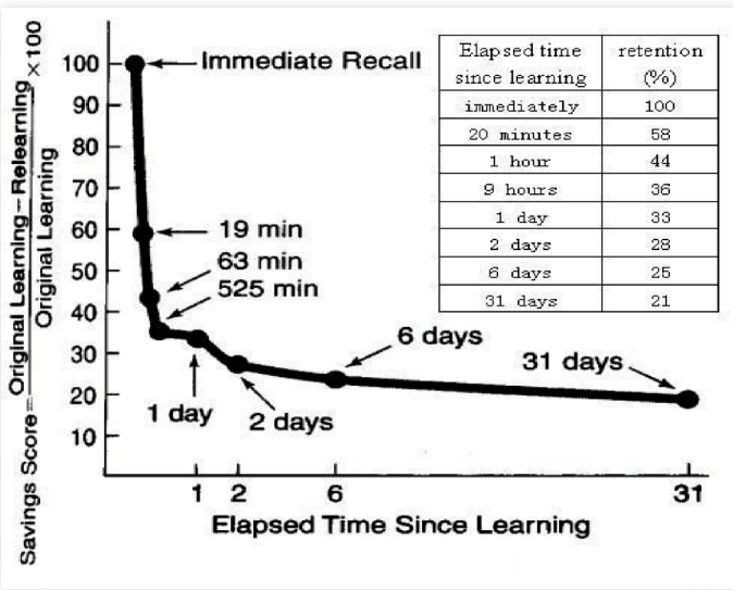 根据艾宾浩斯遗忘曲线,人类大脑在接受新事物时,遗忘是有规律的。遗忘在学习之后立即开始,而且遗忘的进程时不均匀的。我们在记忆的早期阶段遗忘最多,但随着时间的推移,遗忘的数量会减少。一般来说,学习后的两天之内就会遗忘70%以上。