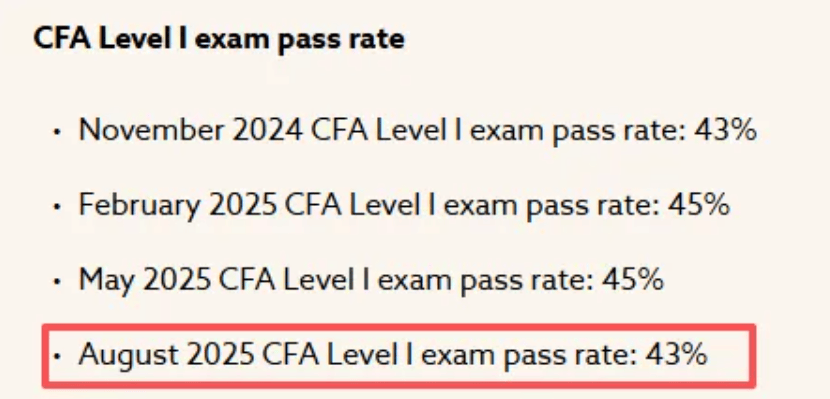 这次的通过率还是比较高的!可以看出2021年机考改革之后,CFA考试通过率相较之前是直线下滑的。2022年2月开始回升,最近几个考季都很稳定,2025年8月CFA一级通过率43%!
