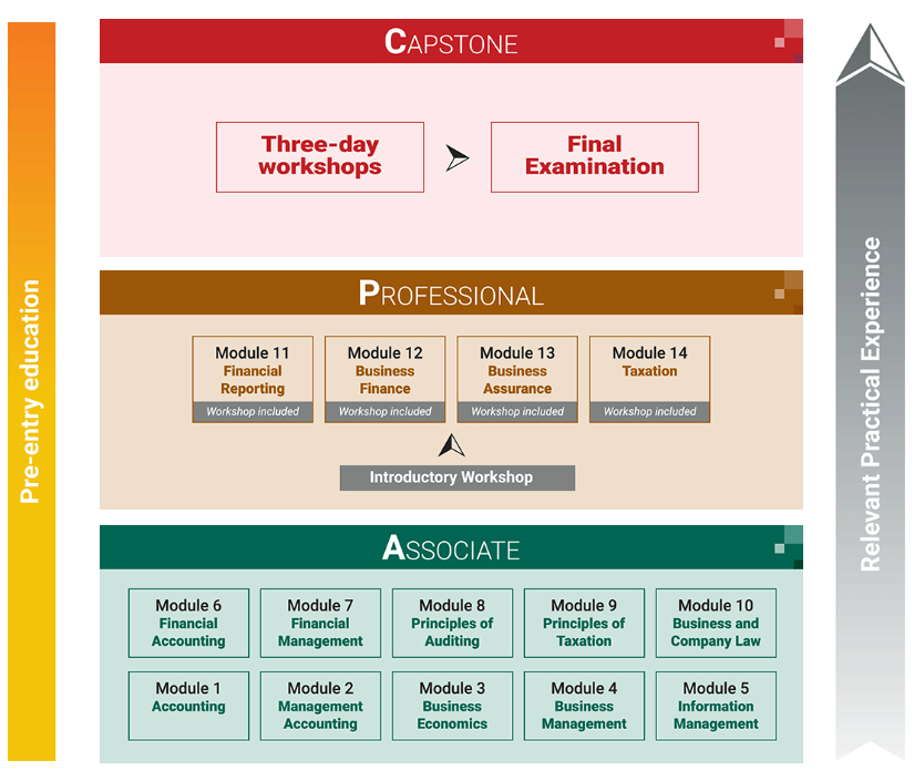 专业级别由4个单元组成;每个单元都有为期一天的工作坊和考试。专业级别旨在让学生具备初级专业会计师所需的核心领域专业知识和实务技能。学生需要理解相关概念、原理和技术,并具备将其应用于真实专业环境的能力,以及运用专业判断去评估复杂问题和建议适切的解决方案。
