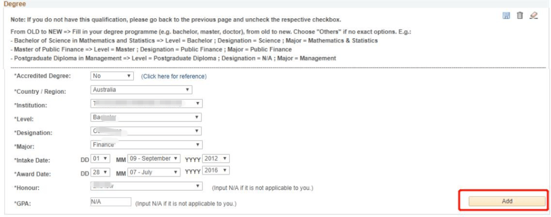 5、以下以Degree路径为例,填写学历信息,如有多个学位,可点击“Add”增加填写栏。