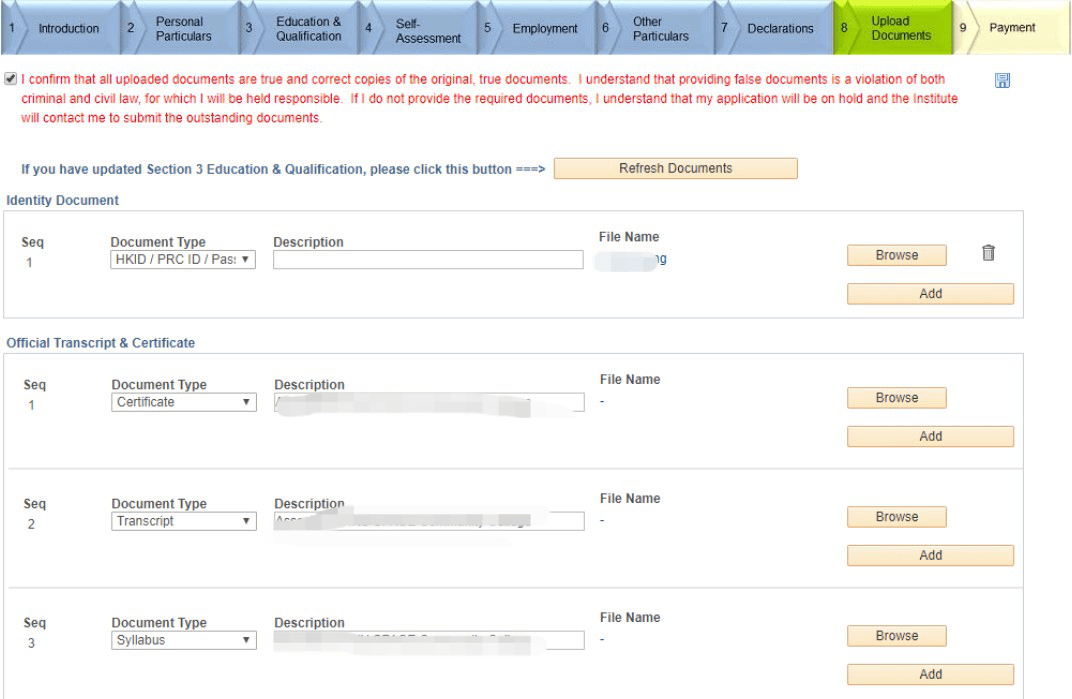 9、上传文件,包含身份证/护照,学历资料,课程大纲,其他资料等。