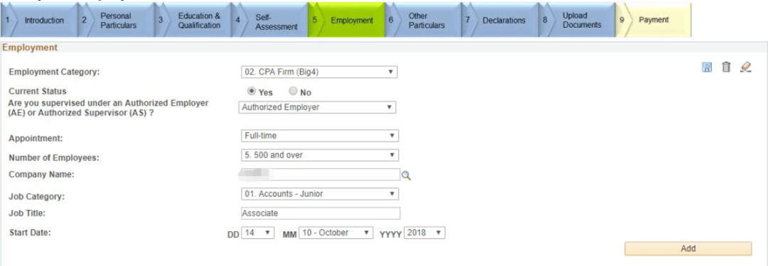 7、填写工作信息,如曾有四大工作经验,可点击“Add“添加曾经工作经历。