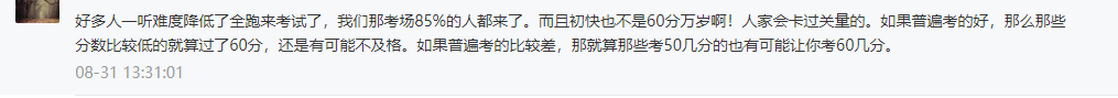 网友:好多人一听难度降低了全跑来考试了,我们那考场85%的人都来了。而且初快也不是60分万岁啊!人家会卡过关量的。如果普遍考的好,那么那些分数比较低的就算过了60分,还是有可能不及格。如果普遍考的比较差,那就算那些考50几分的也有可能让你考60几分。