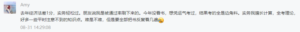 网友2:去年经济法差1分,实务轻松过。朋友说我是被通过率刷下来的。今年没看书,想凭运气考过,结果考的全是边角料。实务我擅长计算,全考理论,好多一些平时注意不到的知识点。难是不难,但是要全部把书反复看几遍。
