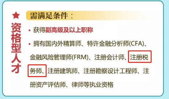 对获得副高级及以上职称,以及拥有税务师(注册税务师)、注册会计师、国内外精算师、特许金融分析师(CFA)、金融风险管理师(FRM)、注册建筑师、注册勘察设计工程师、注册资产评估师、律师等执业资格的资格型人才,可直接落户。