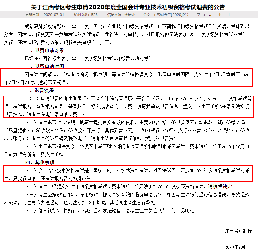 2020年由于疫情,财政部本着人性化的原则给予各地财政厅非常大的调整空间,北京、新疆、深圳、河北等地取消考试,四川、江西和浙江都宣布可以选择退费!