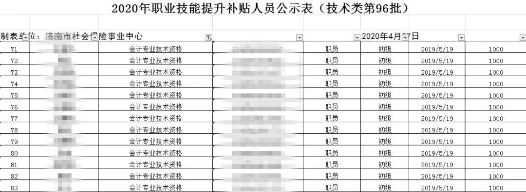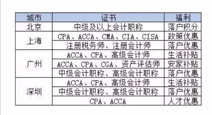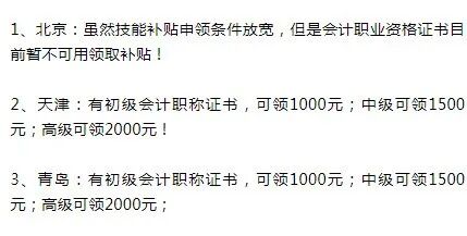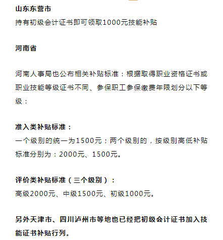 初级过了可以领补贴 山东济南市社会保险事业中心发布拿到初级证书的伙伴可以领取1000元▼ 其实,这个政策已经实行了有一段时间了,从之前的公示表里可以看出。不仅仅是初级考生,中级考生也可领1500元补贴,高级考生可领取2000元▼ (因政策信息不断变化,仅供参考!) 5个城市更新会计证书补贴消息: 初级可领1000元,中级可领1500元! 济南会计已经开始可以申领了,其他地区还会远吗?事实上,2019年以来,技能补贴申领条件放宽了。下面来了解下各地目前实施情况。 北京市——技能补贴申领条件放宽 从北京市人力社保局获悉,2019年起,北京放宽技能提升补贴的申领条件,原来企业在职职工申领补贴须参加失业保险3年以上,现在只需1年以上,此项政策将延续至2020年12月31日。最高可补贴2000元。 广西柳州——技能补贴申领条件放宽 而这份通知,青岛地区和天津地区都可以领取这份补贴! 为什么这些地区可以领取补贴?根据青岛人社局6月份《关于进一步简化流程优化服务加快落实就业创业政策有关问题的通知》的消息,将58项专业技术人员职业资格证书纳入技术提升补贴范围! 这58项专业技术职业资格目录中包括注册会计师和会计职称证书! 至于如何申请?我们以青岛为例: 会计证书的含金量越来越高! 考过企业直接发钱! 证书对于会计人的重要性不言而喻,能够直接决定着你的职业前景,每一步的升迁都需要证书来作为台阶。 然而会计证书的福利不仅仅在这里,随着2019年各地抢人政策的大升级,高含金量证书的持证人被纳入人才激励的行列!被各地政府哄抢!真的是哄抢!给出的福利是一个比一个重磅!送现金补贴,送房产,甚至直接可以落户。 一、拿下中级会计职称,就可以在这些地区落户了 1、杭州、南京:缴纳一定时长社保可直接落户 一些经济发展不错的城市直接给出了诚意满满的优惠政策:在杭州、成都、南京、武汉等城市,持有会计职称和一定时长的当地社保记录便可以直接落户。 只要持有中级会计职称,并在杭州居住并缴纳一年及以上社保者,就可以在杭州直接落户。 就在离杭州不远的南京,中级会计师也得到了同样的“特殊照顾”,南京为中级持证人开放了绿色落户通道,规定:持有中级会计职称,且年龄在35周岁以下者,可直接办理职称入户。 2、上海、广州:赠送高额居住积分 根据《上海市居住证积分管理办法》,在上海持有中级会计职称者可以在居住证上多加100积分。 而在《持有<上海市居住证>人员申办本市常住户口审批》的审批条件中,具备中级职称也是居住证转常住户口的前提条件之一。 同样,在广州,持有中级会计职称也可为持证人增加50分的居住证积分。 3、持有中级会计职称证书,可享房改优惠 按国家规定,中级会计职称还可享受100㎡的房改政策,这样的优惠可不是每个人都可以享受到哦。 二、拿下高级会计师证书,落户、生活补贴样样不落 1、广州:持有高级会计职称证书可直接落户 (1)落户优惠 根据《广州市引进人才入户管理办法》,具有副高级以上专业技术资格,或具有本科以上学历且具有相关专业中级以上专业技术资格或执业资格可申请将户口迁入本市十城区。这意味着,持有中级会计职称的本科毕业生和持有高级会计职称的会计人可以直接落户广州。 (2)生活补贴 根据《广东省引进金融人才认定标准(2017年)》,高级会计师证书皆属于金融专业人才的认定标准之一。 如果会计证书持证者顺利地经评定为专业人才,根据广东省“珠江人才计划”,金融人才将获得最高不超过100万元的一次性生活补贴。你没看错,是100万元。 2、深圳:高级会计师小于50周岁即可申请落户 深圳在会计人才吸引上给出了不少有人政策,除了优先落户,还发放了丰厚的生活补贴。 (1)落户优惠 根据《2017年度个人申办引进在职人才指南》,具备中专学历、且具有中级会计职称、年龄小于45周岁,以及具备中专学历、且具有高级会计职称、年龄小于50周岁的会计人可以在满足基本条件的情况下申请落户。 (2)生活补贴 根据《广东省引进金融人才认定标准(2017年)》,高级会计师皆属于金融专业人才的认定标准之一。如果持证者顺利地经评定为专业人才,根据广东省“珠江人才计划”,将获得最高不超过100万元的一次性生活补贴。 三、更多的我就不一一列举了……附个表给你们! 很多财务的职位,明确要求有会计证书才能应聘。并且证书等级越高,工资给的越多!同时,有些企业还会奖励员工,无论初级、中级或注会,只要过了,就会给奖励!根据网友爆料,很多公司过了初级会奖励500元,中级奖励1000,注会奖励能达到30000元! 虽然,这些爆料不能代表全部。但是也说明了,会计证书越来越吃香,国家和企业都越来越重视!