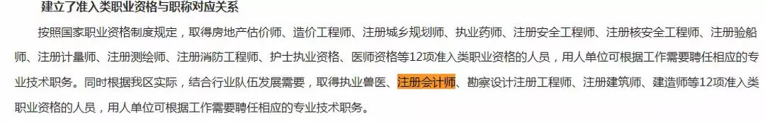 1、确定46项专业技术人员职业资格与职称的对应关系。 2、在对应关系范围内,专业技术人员取得职业资格即可认定其具备相应系列和层级的职称,并可作为申报高一级职称的条件。3、本市用人单位可根据工作需要,对符合对应条件的人员按照相应专业技术岗位任职条件和聘任程序,择优聘任相应级别专业技术职务。 看到这里,有的同学问了,哪里看出注册会计师和中级相对应?别急,真相在附件:《北京市专业技术人员职业资格与职称对应表》里!在表格第2栏,我们显然看到:注册会计师对应会计师。这里,会计师,很明显就是指:中级会计职称。在对应表第23项,我们看到说明:中级资格就是会计师。通过全国统一考试,取得注册会计师等13项准入类职业资格证书的专业技术人员,其职业资格直接对应相应系列和层级的职称,两者享有同等效力。在湖北,有注册会计师证书的对应的是会计师(中级)、审计师。通过国家职业资格考试,取得注册会计师等13项准入类职业资格(见附件)的人员,用人单位可根据相关任职条件和岗位空缺情况聘任相应的专业技术职务。在四川,有注册会计师证书的对应的是会计师(中级)、审计师。