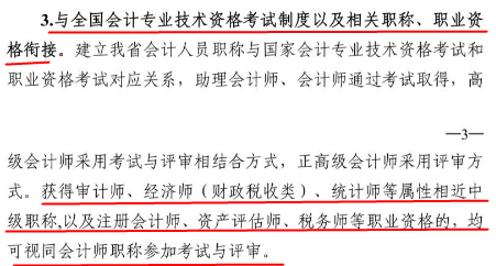 1、将健全职称体系---与全国会计专业技术资格考试制度以及相关职称、职业资格衔接。建立我省会计人员职称与国家会计专业技术资格考试和职业资格考试对应关系。获得审计师、经济师(财政税收类)、统计师等属性相近中级职称,以及注册会计师、资产评估师、税务师等职业资格的,均可视同会计师职称参加考试与评审。北京、湖北、四川、福建、广西、河南地区已确认注册会计师与职称的对应关系,其中北京地区,注会对应会计师;湖北、四川、福建、广西地区,注会对应会计师或审计师;河南地区,注会考核认定为高级会计师!北京人力资源和社会保障局发布公告《关于建立北京市专业技术人员职业资格与职称》,表示: