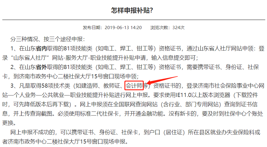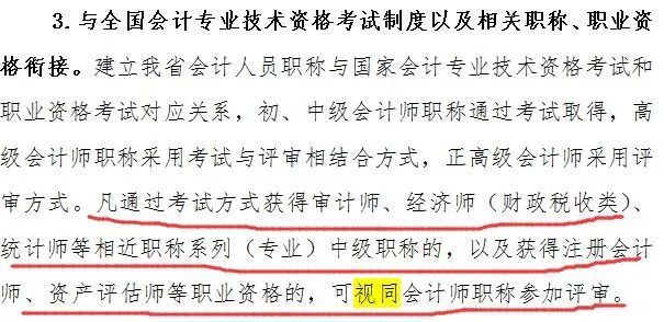 广东省财政厅发布通知:发布关于征求《广东省审核会计人员职称制度改革实施方案(征求意见稿)意见的通知》,表示鼓励用人单位择优聘用相应职称人员,证书在工作加薪中更加重要~建立相关职称、职业资格衔接!并且财政部和人社部联合发文:探索建立会计职称相同或相近科目互认互免等衔接措施,并且湖北省、四川省、福建省、广西壮族自治区、河南省、湖北省等地已经明确注册会计师对应职称资格。广东财政厅发布:关于征求《广东省深化会计人员职称制度改革方案(征求意见稿)》意见的通知,意见稿明确提到:鼓励用人单位将选人用人制度与会计人员职称制度相衔接,引导用人单位根据工作需要择优聘任具有相应职称的会计人员。而且,众所周知,从业取消后,初级会计职称变成一定意义上的“会计入门证书”,很多企业,招聘一定财务岗位时,会明确指出:要求持有初级会计职称证书。但是一旦想走较高阶路线,比如担任财务主管、财务经理,甚至总监等,就需要考下中级会计职称以上证书了。下图是某公司财务经理任职要求描述,明确要求持有中级会计职称证书:而现在,鼓励企业自主择优聘任具有相应职称的会计人员,中级会计职称持有人的社会需求,只会越来越大。目前,2021年国考岗位表暂未发布,大家可先参考2020年,相信同样要求具备中级会计职称证书的岗位也会有哦!2020中央机关及其直属机构考试录用公务员公告已经发布,为大家整理了2020国家公务员考试职位表汇总,在国考职位表当中的“财务工作一级主任科员及以下”岗位,明确说明持有初级、中级或高级会计专业技术资格证书,请注明资格证书编号。以上就是为大家整理的中级会计职称对于报考国家公务员的好处。从公务员的岗位设置以及报考情况来看,持有中级会计证书固然有益于被录取,但是中级会计职称备考周期可能要长达1-2年,而公务员招聘中要求持有中级会计职称证书的岗位较少,有明确限制的更少,为了考公务员而去考取中级会计师可能要低于心里期待值。但这并不意味着中级会计职称无用,只是要转换考证的目的,通过中级会计考试提升的是自身的专业能力,取证之后,就业之路无疑被大大拓宽,除了公务员这个方向之外,自身也会拥有不错的职业发展前景,而即使一心想要成为公务员,中级会计证书也不意味着浪费,即使没有明确的政策将中级会计作为晋升条件,但证书是自身实力的体现,是隐性的辅助。2020中级考试已经结束,查分也将于10月17日前进行,一切顺利进行中。刚刚又惊喜发现:持中级证书,有的考生领到1500元技能补贴了!2020年9月23日,就在上个月,山东济南市社会保险事业中心发布《2020年度职业技能提升补贴公示名单(技术类第116批)》,其中,2019年考下中级会计职称证书的可申领1500元技能补贴。进一步打开公式中的附表,赫然发现2019年考过中级证书的同学,赫然在济南地区2020年职业技能提升补贴人员公式名单中,补贴1500元,截取部分图片:……获得技能补贴的中级考生不止这些,在此不一一截图列举了。而且,在“怎样申报补贴“通知里,也明确标记清楚了“会计师”的申报方式。所以,持中级证书在济南地区,可申请1500元补贴,这是板上钉钉的了。现在把这个消息告诉大家,等到今年查到成绩通过,领完证书,就可以准备领钱啦。现在,大家可能还比较关心的是:符合什么样的条件,就可以申领补贴呢?!申报人申领补贴时,必须是济南市行政区域内的企业在职职工(正在济南市缴纳五险),同时缴纳失业保险费累计满12个月及以上。如果在济南缴纳失业保险费不满12个月而在外地有缴费记录的,需要到外地开具失业保险费缴费记录并现场申报。“国家职业资格目录”包括的139项资格可以申领,其中,58项《专业技术人员职业资格》,81项《技能人员职业资格》。以证书上的“批准日期”为准,离申领日期12个月以内的职业资格证书,可以申报补贴。补贴的标准也顺便说一下:81项《技能人员职业资格》证书,按照初级(五级)1000元、中级(四级)1500元、高级(三级)2000元的标准补贴。58项《专业技术人员职业资格》证书,按照特高级、高级2000元、中级1500元、初级1000元的标准补贴;证书分三个级别,按照从高到低2000元、1500元、1000元的标准补贴;证书分两个级别的,按照从高到低2000元、1500元的标准补贴;证书不分级别的按照2000元的标准补贴。中级证书属于专业技术人员职业资格证书,所以考生持证书可获得1500元补贴。下面,给大家收集了全国23个省,5个自治区,4个直辖市等等全部各省(区、市)地(市)级经办技能补贴业务的机构名称及地址+各地稳岗补贴和技能补贴经办机构信息,会计人如需领取,请扫码回复“补贴”即可☟☟☟实施方案(征求意见稿):凡通过考试方式获得审计师、经济师(财政税收类)、统计师等相近职称系列(专业)中级职称的,以及获得注册会计师、资产评估师等职业资格的,可视同会计师职称参加评审。以实现与全国会计专业技术资格考试制度以及相关职称、职业资格衔接。北京、湖北、四川、福建、广西、河南地区已确认注册会计师与职称的对应关系,其中北京地区,注会对应会计师;湖北、四川、福建、广西地区,注会对应会计师或审计师;河南地区,注会考核认定为高级会计师!北京人力资源和社会保障局发布公告《关于建立北京市专业技术人员职业资格与职称》,表示: